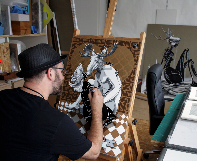 Dome examines the human body and the human condition on a surrealistic manner. Each part of the human body is drawn individually and cut to eventually construct his artwork out of pieces. For this he uses his developed ‘modular construction system’ in which he’s able to rotate the drawn body parts in any way he prefers. This system gives him the flexibility to quickly change the composition.